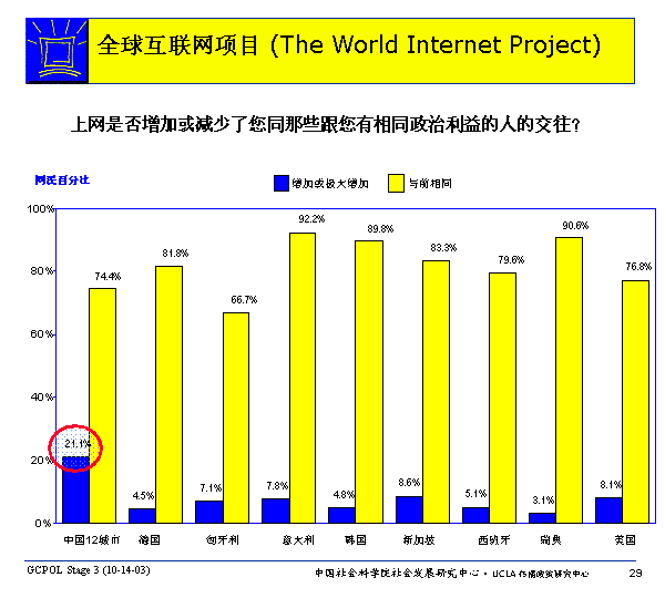 上網沒有改變大多數網民同那些有相同政治利益的人的交往數量。然而,少數網民報告使用互聯網增加了與這些人的交往;這類網民最多的是在中國,21.1%的網民報告他們增加或極大增加了同這類人的交往。