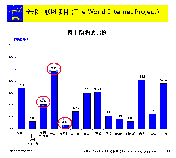 各國網民網上購物的比例各不相同,德國為最高(48.3%),匈牙利為最低(3.4%) 。當然,有網上購物經驗不等于經常上網購物,也不等于在網上花很多錢購物。按照社科院社會發展研究中心的數據,中國網民上網購物的頻次和網上購物支出的錢數都是相對比較低的。