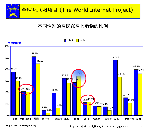 在除韓國和澳門以外的所有WIP國家里,男性比女性更可能網上購物。