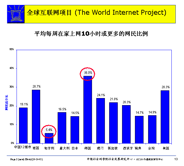 每周上網時間最多的是韓國人,55.7%網民每周上網10小時或更多(包括所有場所) ,匈牙利比例最低,只有15.1%的網民。