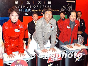 蕭芳芳、劉德華、芳艷芬齊為香港《星光大道》打手印。1月5日,香港舉行《星光大道》第四次打手印儀式,三位為香港影壇作出貢獻的影星蕭芳芳、劉德華、息影女星芳艷芬為香港《星光大道》打手印。作者:鄧慶樂