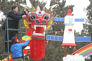 工作人員一月十七日在北京勞動人民文化宮安裝調試巨龍造型的風箏和神州飛船造型的彩燈。來自濰坊的風箏與天津的彩燈春節期間一同亮相太廟民俗文化游園會,扮靚節日的京城。中新社記者:毛建軍