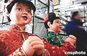 云集中國各地五百多家商戶的北京天外天小商品批發市場內,一對童男童女玩偶在中國農歷甲申猴年來臨前夕向來往客商拜賀新年,增添濃濃節日氣氛。中新社記者:鄒憲