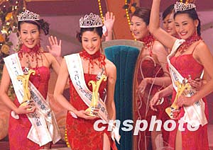 中新網1月18日電 “2004年度國際華裔小姐競選”昨晚在香港將軍澳電視廣播城舉行,來自溫哥華的鐘嘉欣以黑馬姿態勝出,勇奪冠軍。香港的曹敏莉也不負眾望,奪得亞軍及友誼小姐;季軍及“笑靨花容小姐”獎項則由來自馬尼拉的洪巧玲奪得。