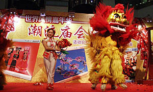 時(shí)近春節(jié),以現(xiàn)代潮流著稱的北京東方廣場將中國傳統(tǒng)廟會(huì)形式搬入東方新天地商城內(nèi),以營造濃濃的中國民俗風(fēng)情。圖為商城內(nèi)進(jìn)行的舞獅表演。甄雪原攝