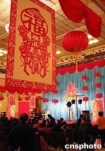 北京人民大會堂春節前夕舉行聯歡會,明亮的大廳內高懸福字,慶祝中國農歷猴年的到來。中新社記者:毛建軍