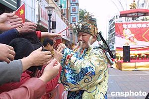 活動(dòng)中裝扮一新的“財(cái)神”正給市民和游客派利是(紅包)。作者:何雪妍