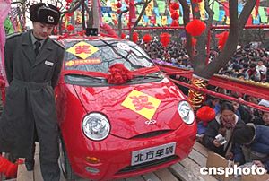春節期間,北京民政局借白云觀廟會的旺盛人氣,恢復推出即開型實物彩票,大批逛廟會的市民爭相購買彩票,希望摸得汽車等大獎。中新社記者:張煒