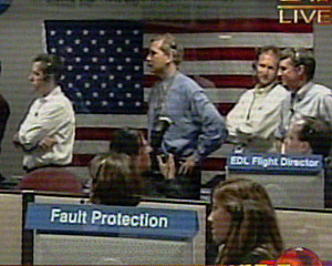 美國國家宇航局噴氣推進實驗室的火星著陸系統總工程師、華裔科學家李煒鈞(Wayne Lee,站立者)與同事緊張指揮調度。