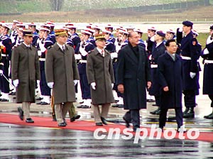 中國國家主席胡錦濤乘專機于巴黎時間下午兩點四十分抵達巴黎奧利機場,開始對法國進行國事訪問,法國總統希拉克夫婦親自到機場迎接。圖為胡錦濤在希拉克陪同下,檢閱法國三軍儀仗隊。作者:曹偉