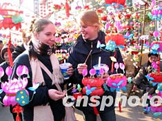 一月二十七日(正月初六)陽光明媚,南京夫子廟燈卉大市場異;鸨。在南京過“中國年”的德國留學生任寧寧和好友相約,利用假日逛起了燈卉大市場,選購中意的花燈,她們邊走邊交流在中國過年的感受。作者:丁東升