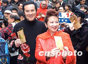香港新城電臺1月27日舉行甲申猴年新春團拜,新城電臺行政總裁甘國亮與《家天下》主持薛家燕在新春團拜活動上大派利是。作者:鄧慶樂