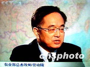 中國(guó)農(nóng)業(yè)部總畜牧師賈幼陵日前在接受中央電視臺(tái)采訪時(shí)表示,中國(guó)正進(jìn)一步完善突發(fā)高致病性禽流感疫情應(yīng)急機(jī)制,建立和完善快速反應(yīng)體系。圖為賈幼陵接受采訪時(shí)的電視畫面。中新社記者:賈國(guó)榮