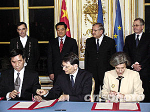 中、法兩國二十八日晚在巴黎簽訂了九項合作協議,正在法國訪問的中國國家主席胡錦濤和法國總理拉法蘭出席了簽字儀式。簽字儀式前,胡錦濤會見了拉法蘭。作者:蔚中