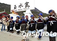 中國農歷猴年正月,六名納西族老太太在云南麗江玉龍雪山腳下的旅游景點前用別致的民族歌舞,向游人表示新年的祝福,借以換取一定的經濟來源。中新社記者:趙振清