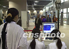 澳門新關(guān)閘邊檢大樓二日開始啟用,新的出入境大廳使用了許多先進的設(shè)備,圖為入境大廳使用的測溫設(shè)備在入境人員不留意間已經(jīng)將體溫測出。中新社記者:李剛
