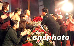 二月四日晚,北京市市民在政協禮堂舉行的紀念鄧穎超誕辰100周年的文藝晚會上,向鄧穎超塑像獻花,緬懷這位偉大的女性、慈祥的媽媽。中新社記者:史利