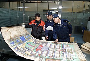 在北京海關空運快件監管中心查驗現場,包括古舊女士布鞋、面具、人像木雕、陶瓷茶壺、繡品在內的80余件文物擺滿了海關查驗臺。在這次查獲的文物中,最為珍貴的就是一支古舊陶罐。該陶罐呈灰黑色,大概有20厘米高,罐口直徑有7、8厘米。在陶罐的表面刻有“康熙22年制”字樣。另據專家介紹,此次查獲的兩幅祖宗圖也極為珍貴,兩幅圖分別為祖宗牌位圖和人像圖。人像圖近3米見方,牌位圖也有1.2米寬,2米多長。專家稱,這三件文物均屬于國家禁止出境的文物。