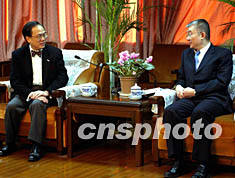 由香港政務(wù)司司長曾蔭權(quán)率領(lǐng)的政制發(fā)展專責(zé)小組,二月九日上午與國務(wù)院港澳事務(wù)辦公室副主任徐澤(右)會面。中新社記者:鄭萍萍