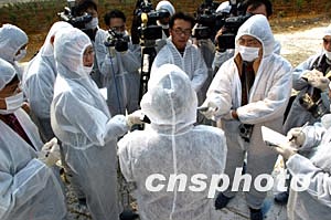 中外十四名記者,十二日深入中國內(nèi)地首發(fā)禽流感疫點(diǎn)--隆安縣丁當(dāng)電灌站采訪。中新社記者:宋吉河