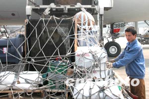 記者在成都機場貨運出口看到,大熊貓“華美”安靜地坐在自己的籠子里,它時而漫不經心地看著外面為給它拍照而擠作一團的記者們,時而低頭悠閑地吃著從美國帶回的美味“洋竹”!叭A美”隨身帶有十三件行李。在它的行李中裝的全是它平時吃的玩的,有美國竹子、餅干、飲用水等。最引人注目的是還是“華美”愛玩的棕色大皮球。