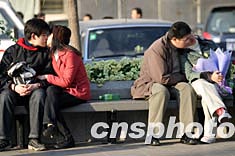 二月十四日是西方的情人節(jié),北京街頭兩對情侶在同一條長椅上享受著各自的溫馨、浪漫。中新社記者:盛佳鵬