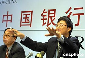 中國銀行行長經濟顧問朱民(右)十六日在中行新聞發布會上表示:中國銀行將在一年內將不良資產降到國際一般商業銀行水平,采用逐筆檢銷不良資產、建立新型戰略體制、強化內控體系和風險管理和人力資源改革四大步驟全面推行股份制改革。中新社記者:廖文靜