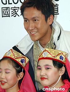 香港藝員馬德鐘二月十七日出席在香港舉行的“馬可波羅現代東游記”攝影展開幕式,與表演新疆舞的小朋友一起拍照。作者:錢興強