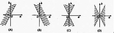 此題的完整解是(—b—>2—a—,且a≠0)。{證明:函數y=ax2+bx+a的圖像與x軸有兩個交點,就是方程ax2+bx+a=0有兩個不同的實根。其充分必要條件是a≠0,且b2>4a2。即(—b—>2—a—,且a≠0)。}在圖A、B、C和D中,凡虛線均表示不屬于區域的邊界,凡相鄰而不同斜率的陰影線均表示相鄰而不連通的區域,這是符合慣例的。[關于區域的定義,可見《數學》,第二冊(上),普通高級中學教科書,p.58:
