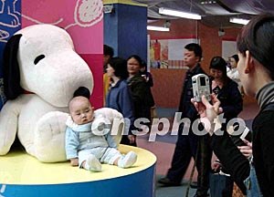 香港新都城中心舉行的「Snoopy in Fashion」國際名師時裝世界巡回展于22日結束,一家大小的市民爭相與主角史諾比合照。作者:譚達明