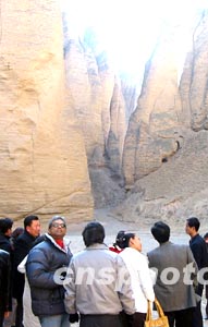 中國國土資源部日前公布,四川九寨溝、甘肅景泰石林等被評為“國家地質(zhì)公園”。甘肅景泰石林位于甘肅省景泰縣,生成于四百萬年前,由地殼運動、風(fēng)化、流水侵蝕和重力崩塌形成,其石柱、石筍均由桔黃色砂礫巖構(gòu)成,大多高達八十至一百米之間,最高達二百多米。圖為聯(lián)合國教科文基金水利工程協(xié)會的專家前來考察屹立在黃河兩岸的甘肅景泰石林。作者:殷春永