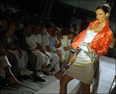 面對著6組射程在38公里的“飛魚”導彈的發射裝置,在2門100毫米口徑的自動炮的下面,一條長達40米的白色塑料毯上,模特們展示著各名家的服裝作品。