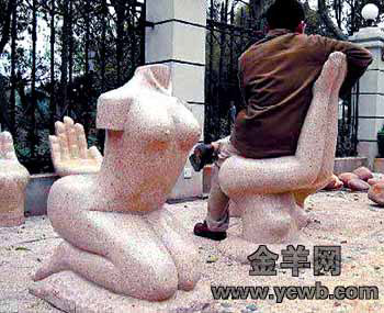 中新網3月13日電 “夢澤園小區竟然擺放了兩張女性裸體造型的石椅,其中一張是下跪的女人翹著臀部當椅子,另一張則是女性倒立舉起大腿給人當靠背,真是丑死了!”昨日,家住長沙蓉園社區的陳老師指著兩張人體藝術石椅,憤憤不平地說。