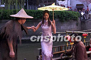 三月十四日,“古鎮西塘”2004年國際旅游小姐大賽中國區總決賽在西塘古鎮新搭建的水上舞臺進行大賽前的整體排練,三十二位參賽佳麗逐個乘坐烏蓬船登上舞臺。中新社記者:盛佳鵬