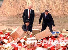 三月十五日,廣東省酒類專賣管理局在廣州從化市舉行大型銷毀假冒偽劣酒類產品現場會,銷毀假冒高檔名酒“水井坊”、“五糧液”、“軒尼斯”、“藍帶”、“金牌馬爹里”等及假冒標識、包裝物,共值約3500萬元。國際洋酒協會(IFSP)董事長伍國豪(左)先生等到場協助。作者:鄧嘉樂