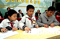 “希望工程——金龍魚農民工子女助學基金”儀式課三月十六日在廣州新蕾五星學校舉行。首批2000名農民工子女得到資助。這些孩子將從2004年起得到每學年六百至九百元人民幣的助學金,以幫助其完成小學學業。作者:劉衛勇