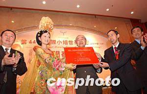 3月18日,“第44屆國際小姐世界大會”組委會在北京宣布,“國際小姐世界大會”將于10月18日在北京舉辦。曾參加“2003年國際小姐世界大會”并獲得最佳民族服飾小姐獎的王珊和日本國際文化協會會長伊達邦美(右三)、中國國際文化傳播中心會長龍宇翔(右二)一同出席交接儀式。中新社記者:盛佳鵬
