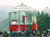 2∶45,三位雅安市公證處的公證人員對陳建民的隨身物品進行了嚴格的檢查,在確定沒有任何違背挑戰活動承諾的物品后,陳建民才被吊車送進了14米高的玻璃房。
