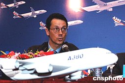 空中客車公司價(jià)格政策高級(jí)副總裁奧利維安德列斯,三月二十四日在北京介紹擁有555個(gè)座位的超大型飛機(jī)-A380飛機(jī),并對(duì)中國(guó)市場(chǎng)前景極為樂(lè)觀。首架A380飛機(jī)今年五月開(kāi)始總裝,二零零六年計(jì)劃投入運(yùn)營(yíng)。作者:王麗南