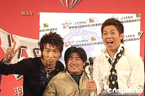 三月二十五日,羽泉組合在北京宣布,將于今年五月在北京首都體育館舉行名稱為“紅五月”的演唱會。圖為發布會上羽泉組合與歌迷一道接受中國歌曲排行榜的頒獎。作者:高遠