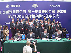 中新網北京3月29日電(通訊員郭化南 記者王魯平)在中國國內重型卡車市場占有重要地位的中國重型汽車集團有限公司和中國第一汽車集團公司,今天在北京釣魚臺國賓館與世界發動機技術行業研究開發與生產制造巨頭瑞典沃爾沃集團簽署了發動機生產合作框架協議,三方將聯合打造世界一流發動機生產基地。