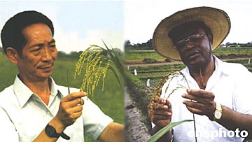 被稱為中國“雜交水稻之父”的袁隆平教授和來自塞拉利昂的瓊斯博士因在培育高產水稻方面的杰出貢獻,29日在美國首都華盛頓被授予二00四年度“世界糧食獎”,兩人分享二十五萬美元的獎金。中新社圖
