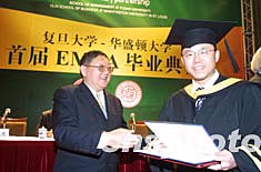 由復旦大學和華盛頓大學合作的復旦——華盛頓首屆EMBA學員畢業典禮四月三日晚在上海舉行,這是中國國內高校首屆EMBA畢業典禮。作者:湯彥俊