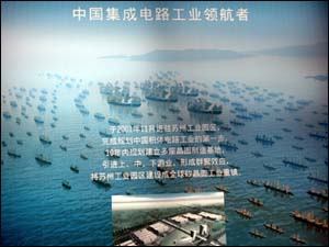 宋濤在鄭和艦隊帷幕前向記者介紹說,和艦科技是一家外資獨資企業,注冊資本三點五億美金,二○○一年十一月進駐蘇州工業園區,第一座晶圓制造廠占地一點三平方公里,而蘇州給和艦科技留下了一百十公頃土地。