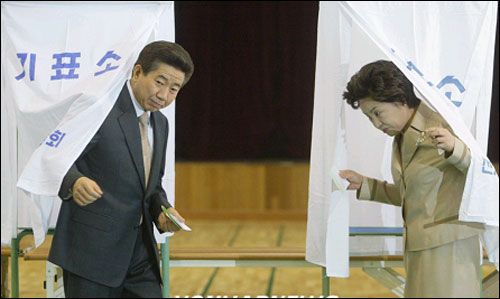 在韓國歷史上、第一個遭國會反對黨彈劾的總統(tǒng)盧武鉉,也在妻子的陪同下前往投票。盧武鉉也呼吁國民積極地參與投票。