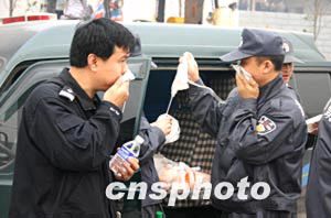 四月十七日,在重慶市天原化工總廠附近待命的警察正在領取口罩。十五日晚,該廠發生氯氣泄漏事故,有十五萬人撤離。作者:鄒輝