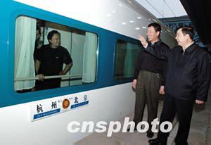 四月十七日晚,鐵道部副部長(zhǎng)孫永福(右)和北京鐵路局負(fù)責(zé)人在北京火車站為中國(guó)鐵路第五次提速的首列提速車送行。中國(guó)鐵路第五次提速十七日晚開始,新開行的十九對(duì)直達(dá)特快列車中,北京開往杭州的Z9次,于十八點(diǎn)五十三分首發(fā)開始運(yùn)行。中新社記者:王麗南
