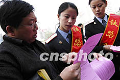 四月十八日,山西省太原火車站的工作人員向過往旅客發放新列車時刻表。當日是全國鐵路提速第一天,太原火車站設立咨詢臺,為旅客提供鐵路提速等各方面的信息。作者:陳帆