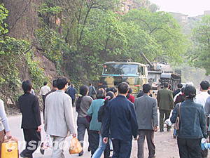 四月十八日下午六時(shí)許,離事發(fā)地中央核心區(qū)域僅兩公里的螞蝗梁拉起的警戒線(xiàn)終于撤下。疏散出去的附近居民歸心似箭,快步走在回家的路上,今天排險(xiǎn)過(guò)程中發(fā)炮的坦克吸引了他們.十五日晚,重慶天原化工總廠(chǎng)發(fā)生氯氣泄漏事件。作者:郭晉嘉 郭虹