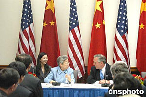 四月二十一日在美國華盛頓舉行的第十五屆中美商貿聯委會上,中國國務院副總理吳儀告訴美國人:中美經貿并非此消彼長,而是互利雙贏。圖為吳儀與美國商務部部長埃文斯共同會見記者。作者:余東暉